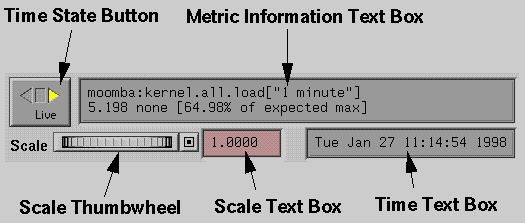 As shown in Figure 1-1, the pmview window is comprised of a menu bar, time and scale controls, metric and time values, and an `examiner' Open Inventor viewer which displays the 3D scene.
