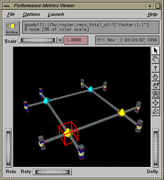 Make sure the pointer cursor is active (select the pointer button on the right-hand edge of the window, or press escape). Move the pointer over different objects in the scene. Metric information and values for the object currently under the pointer will be displayed in the metric information text box (located beneath the Menu Bar).