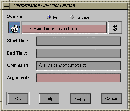 The radio buttons at the top of the dialog define the metrics source - metrics can be fetched either from a host, or from an archive. When the Host radio button is chosen, a host name can by typed or a host icon may be `dropped' into the chooser below the radio button. When the Archive radio button is chosen, a valid PCP archive filename can be entered or a PCP archive icon may be dropped into the chooser. The radio buttons and chooser are only displayed if the PCP application in question can fetch metrics from either an archive and a host.