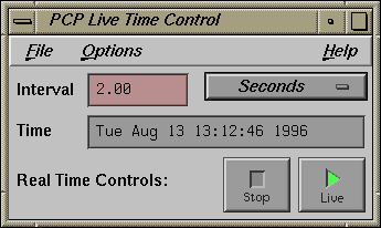 The Live Time Control dialog allows the user to change the update interval, the reporting timezone, and the reported time resolution used by the application(s) attached to this pmtime instance. The update interval can be changed by editing the text box labeled Interval. The change does not take effect until the enter key is pressed. The option menu to the right of the update interval text box allows the units of the update interval to be changed from the default Seconds to other natural untis of time such as Minutes or Milliseconds. To change the reporting timezone, use the Options/Timezone menu choice and select a new timezone from the cascading radio menu. This will change the timezone used to display dates and times in the pmtime dialog and in all the applications attached to this pmtime instance. The text box labeled Time cannot be edited, however, you can select Options/Detail/Show Milliseconds to display millisecond resolution if required, or deselect Options/Detail/Show Year to suppress the year.