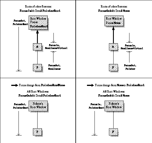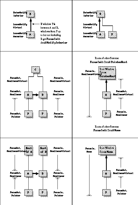 We will now embark on specifying the types of events sent to each window and the detail member in each event, depending on the relative position in the hierarchy of the origin window (old focus), destination window (new focus), and the pointer window (window containing pointer at time of focus change). Don't even try to figure this out unless you have to.