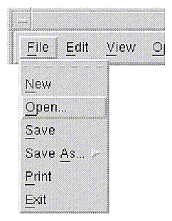 Pulldown Menus are accessed from the labels that represent them. When you select the label of a Pulldown Menu, the Menu pane appears like you had pulled down a window shade. The most commonly used Pulldown Menus in an application are placed on the MenuBar of an application. Figure 3-5 shows a File Menu pulled down from the MenuBar.