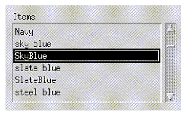 The Container component also supports keyboard selection. If a Container has the input focus, you can use the keyboard to navigate through the items and make selections. Container components use a location cursor to indicate which item has the input focus. The location cursor is shown by a box around a Container item. Use the up and down arrow keys to move the location cursor through the items. Depending on the type of Container you are using, the selection may move with the location cursor. If the selection does not move with the location cursor, you can select an item by pressing Return or Space.