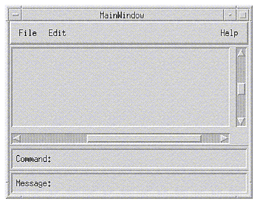 Every Motif application contains a MainWindow, which organizes the contents of the application. Generally, you access primary functionality of an application through components in the MainWindow. The components included in a MainWindow will vary from application to application. The MainWindow in a typical application may contain a MenuBar, ScrollBars, and areas for entering commands and viewing messages, as well as the components that are specific to the application.