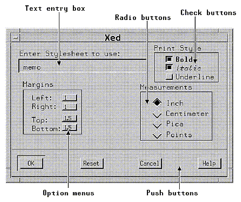 Applications can design DialogBoxes with any number and any combination of components. Figure 3-9 shows a DialogBox that contains many different components for adjusting the settings for a text editor.