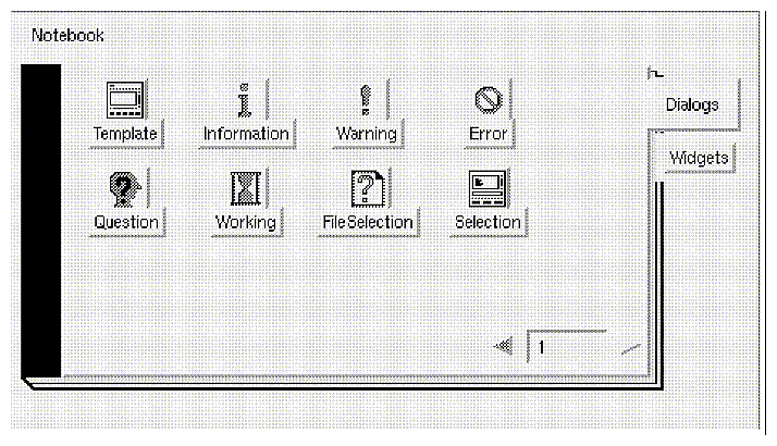 A Notebook simulates a real notebook by grouping components into separate pages. It also contains components for accessing pages and describing pages. Only one page can be seen at a time (see the example Notebook application in Figure 3-28). The page shown in the example is a Container component that displays dialog icons; however, the Notebook can be used to contain any component and so can be used for many different applications.
