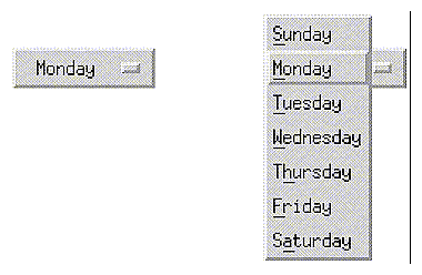 An Option Menu presents a list of choices within a relatively small space. A bar graphic on the right side of an OptionButton signifies the presence of an Option Menu. When you select an OptionButton, the associated Option Menu is presented and you can make a selection. When the Option Menu is not posted, the OptionButton displays the current selection. Figure 3-7 shows an OptionButton with its bar graphic and the associated Option Menu.