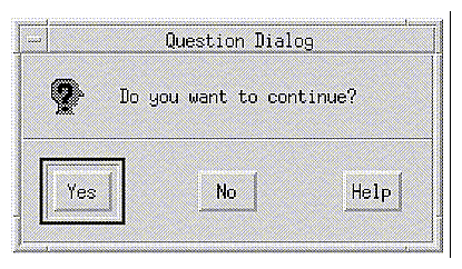 Motif also provides a number of different types of MessageDialogs, including an ErrorDialog, an InformationDialog, a QuestionDialog, a WarningDialog, and a WorkingDialog. Each type of MessageDialog contains a graphical symbol that represents its purpose, a textual message, and PushButton commands that are appropriate for the DialogBox. Figure 3-11 shows a QuestionDialog. A QuestionDialog contains a question symbol, a message that asks you a question and PushButtons that allow you to answer the question.