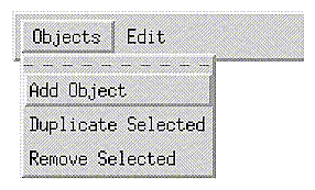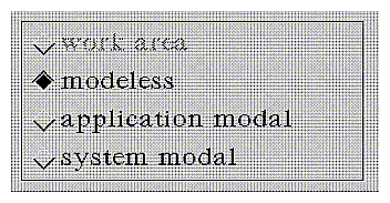 Option Menus provide both spring-loaded and posted interaction styles. Select an item on an Option Menu just as you would on a Pulldown Menu. To cancel a posted Option Menu, click Button 1 on the bar graphic or anywhere outside of the Menu pane.