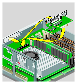 Look from the side and align the gold-colored PCI edge connector with the slot on the system board.