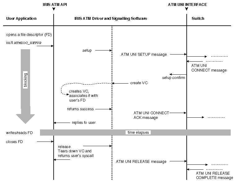 This ioctl() causes the ATM signaling software to initiate an ATM UNI SETUP request message for creation of both a forward and a backward channel. To maximize throughput, set the size for the forward VC's user protocol data units (CSPDUs) to MAX_CS_PDU. When the remote endpoint accepts the connection request, the driver wakes the caller up and returns the negotiated traffic contract, which can be different (smaller) than what was specified in the call. Once open, the SVC is accessed by read() operations from and write() operations to the specified file descriptor. The file descriptor opened for the ATM device (fd_atm) should be readable and writable.[9]