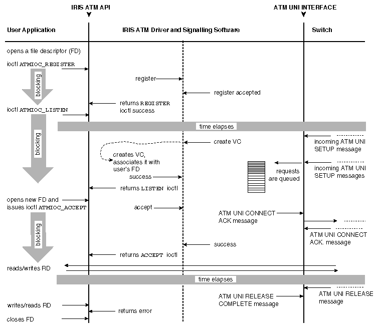 When this ioctl() returns successfully, the ATM signaling software has created a queue of the length specified by the application and has started queuing incoming connection (ATM UNI SETUP) requests. As long as the file descriptor remains open, the ATM signaling software continues to queue requests.
