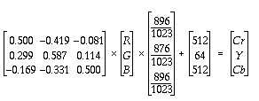SGI, has verified both through simulation and hardware testing that the maximal error for two conversions (RGB to CCIR to RGB) is two units out of 1024. The matrix coefficients have been biased to round slightly high rather than slightly low to avoid the type of problems that can otherwise easily occur in the blue component.