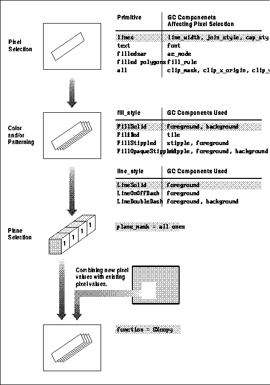 Since we are not yet using any of the tricks that require use of the plane_mask or logical function, the third and fourth stages in Figure 5-1 use the default values of these GC elements. They therefore do not modify the result of the graphics primitive.