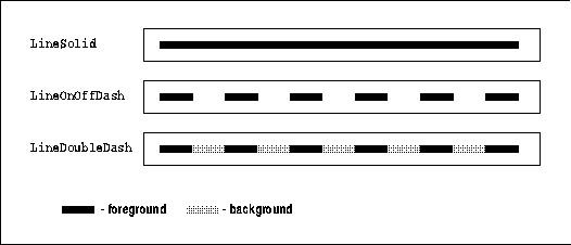 | LineOnOffDash | Specifies that only the dashes are drawn, with the foreground pixel value, and cap_style applied to the ends of each dash (except that CapNotLast is treated as CapButt for dash ends). | |