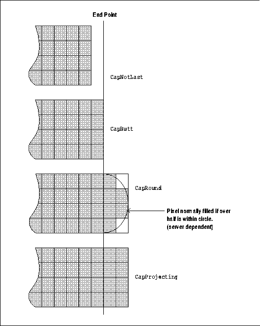 The cap_style member of XGCValues defines how the endpoints of lines are drawn, as shown in Figure 5-3. The cap style can be set with XSetLineAttributes(). The constants used to set cap_style are as follows: