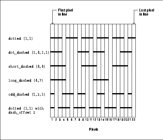 The line_style member of XGCValues defines which sections of a line are drawn and in which pixel value, as shown in Figure 5-2. The line style can be set with XSetLineAttributes(). The actual length of each dash and gap is set by the dashes member of XGCValues, described in “Dash List and Offset” The constants used to set line_style are as follows: