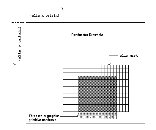 A few more words are needed regarding the distinction between the roles of the graphics primitive and the GC. You can think of a graphics primitive as specifying the general shape to be drawn, while the GC specifies how to draw it. For example, a primitive that draws a filled rectangle specifies the top-left corner of the rectangle in the drawable and its dimensions, while the GC specifies its color or the pattern applied to it (among other things). Note that both the graphics primitive and the GC play a role in selecting exactly which pixels are drawn. For example, the graphics primitive specifies the start and end points for lines (including unfilled arcs, rectangles, and polygons), while the GC specifies the width of the line and the shape of the joints and ends of the lines.Other components of the GC affect pixel selection with othergraphics primitives. For all primitives, the GC includes a clip mask that you can use to restrict which pixels are drawn.