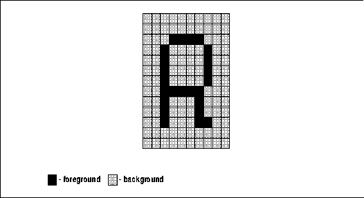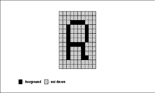 Figure 5-13 shows the use of the foreground and background values when drawing a character with XDrawImageString(). This primitive draws both the character and its bounding box. The character itself is drawn in the foreground pixel value; the remainder of the pixels in the bounding box are drawn with the background pixel value.
