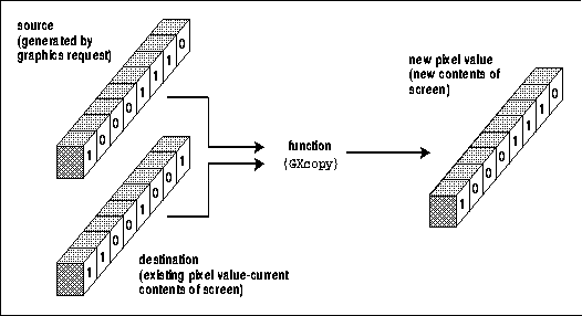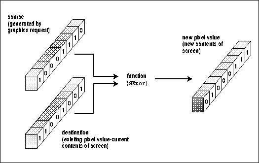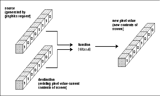 The function member of the GC selects a logical function. Logical functions control how the source pixel values generated by a graphics request are combined with the old destination pixel values already present on the screen or drawable to result in the final destination pixel values. Logical functions are also sometimes called raster operations, raster ops, or display functions. The logical function can be changed by a call to XSetFunction().