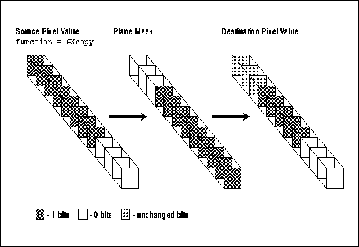 That is, if the plane_mask bit is set, the source and existing destination pixels are combined using the logical function represented by FUNC. If the plane_mask bit is not set, the existing bit in the destination is not changed.