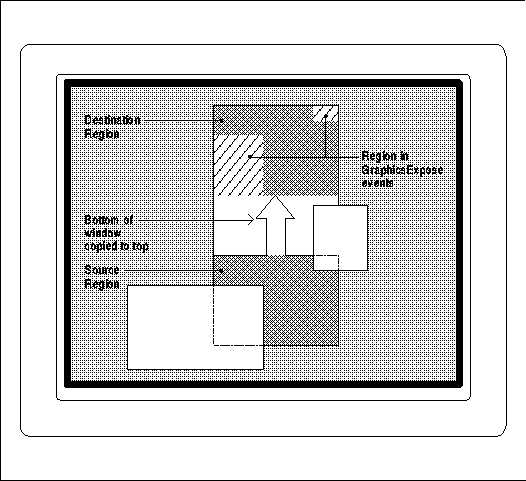 Figure 5-16 shows a typical XCopyArea() request where the source region is obscured. It shows the areas that would be specified in the GraphicsExpose events generated.