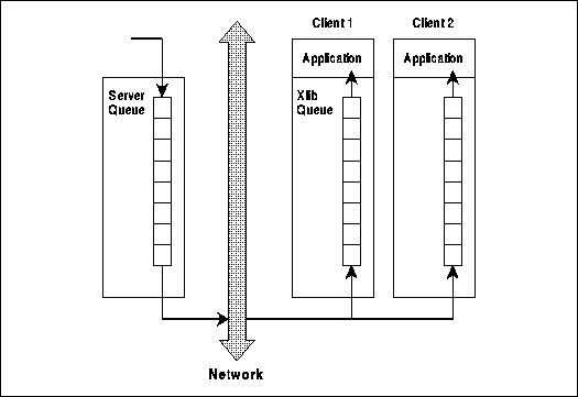 The event structures are placed on an event queue in the order they occur, so that the program can read them and act accordingly. As shown in Figure 8-1, the server maintains one event queue, on which all events are placed, and distributes events to the Xlib in each client. The events in the server's queue are periodically transferred over the network to the Xlib queues. Two clients can receive copies of the same events if they each select them.