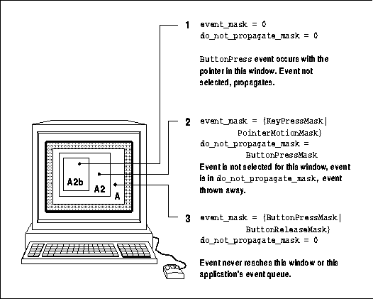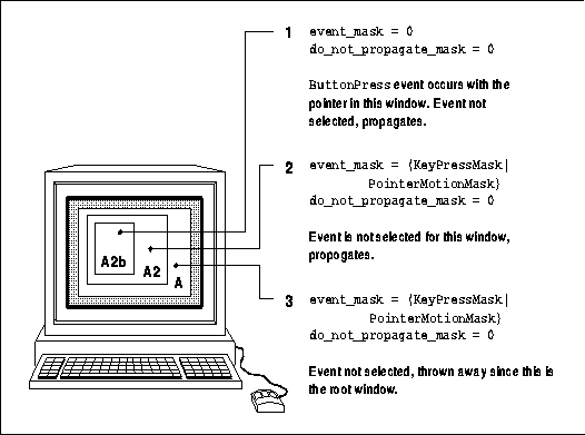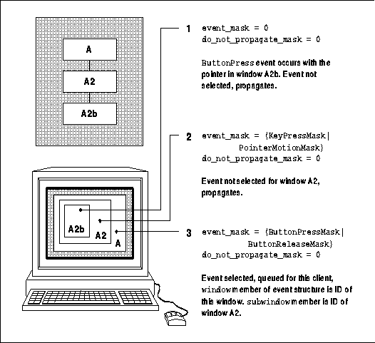 Most event structures also have a window member, which indicates the window that selected and received the event. This is the window where the event arrives if it is a keyboard or pointer event and has propagated through the hierarchy, as described in “Propagation of Device Events” One event type may have two different meanings to a client, depending on which window the event appears in.