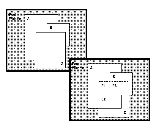 An Expose event tells a client which window or area within a window has just become visible. The usual response is to redraw the contents of the area or of the entire window, if that is easier and comparably fast. Figure 8-5 shows a typical window hierarchy before and after window C is lowered. Two Expose events are sent to window A specifying areas E1 and E2, and one Expose event is sent to window B specifying area E3.