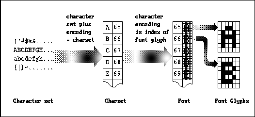 Before R5, the Xlib drawing routines made the fundamental assumption that the encoding of a character was equal to the index of the character's glyph in the font. As explained in “Text Representation in an Internationalized Application” this is a useful and valid assumption when text in a language can be most naturally encoded as an 8- or 16-bit wide charset. Unfortunately, it is not valid in many important cases.