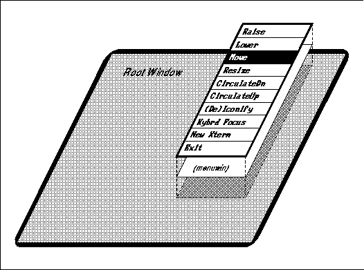 The first issue that comes up when writing a menu is how to layer the windows that contain each menu item. It would be possible to write a menu that only used one window, placing the text within the window in the right places and highlighting areas when the pointer coordinates in the ButtonPress events indicated that an item was chosen. This is a hard way, because it does not take advantage of X's windowing capabilities. It would also be possible to make each menu panel a subwindow of the root window. While this would simplify the event handling and highlighting, we would have to define a cursor for each of the windows. More importantly, the user would have to move all the windows separately if the menu were to be moved, unless we monitored movement of any one of the windows and made the rest follow. There are also other ramifications, including that it would be difficult to identify the menu as a whole to make sure it was not iconified; this would require comparing the IDs in events with the IDs of all the windows. The best solution is a combination of the above approaches.