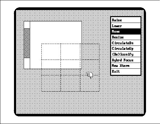 If Move or Resize is chosen, the user must press a pointer button on the window to be manipulated, drag the pointer with the button held until the outline of the window is in the chosen size or position, and then release the button. (winman's own menu can be moved but not resized.) A moving outline of the window is used to indicate the intended dimensions or position of the window.