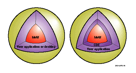 CDE, however, uses Motif as its underlying toolkit. Applications developed for CDE must adhere to the same style guidelines as Motif applications running under another window manager as well as to CDE-specific style guidelines (see Chapter 13, “Common Desktop Environment Guidelines” for more information). Figure 1-1 shows the relationship of applications with and without CDE.