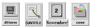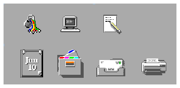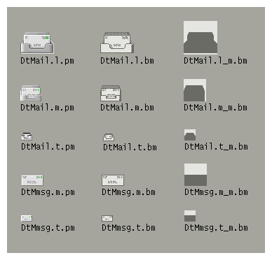 Most CDE icons are not color intensive, using grays instead. This keeps the number of colors on the desktop palette to a minimum and works well visually. Because the icons, being largely colorless, always appear in the context of colored backgrounds, they stand out more.