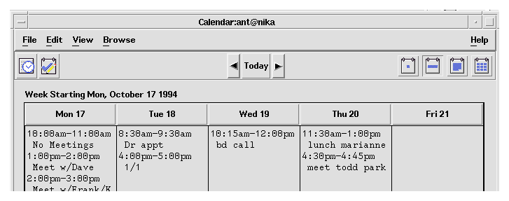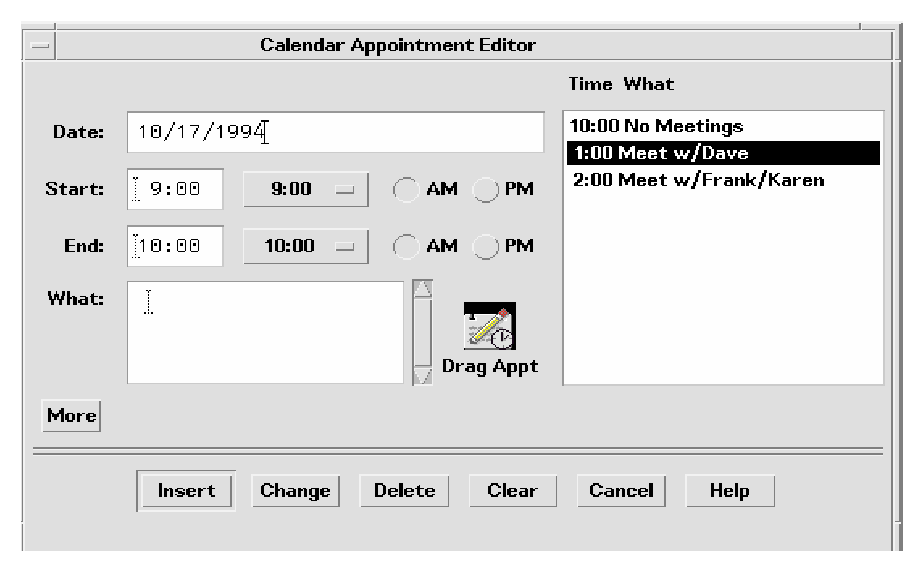 The recommended method for indicating that the user can drag something is to include a draggable icon graphic in the dialog box. This icon graphic must be the same icon that represents data in File Manager. In Calendar, the appointment icon is shown just as it would appear in File Manager (see Figure 13-23), with a label under it. This is the same icon that the drag icon source indicator uses. Place the icon graphic in the dialog box adjacent to the information to be dragged. The upper right corner of the dialog box or window is the default position, but you can change it for your application. In Calendar Appointment Editor, the icon is placed near the main text field to indicate that you can drag the text fields.