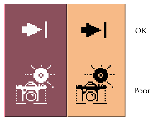 Design your icon primarily to use the eight static grays; use the eight static colors mostly as accents. The eight static colors are strong and can easily be overused. The static grays allow icons to blend gracefully with the already colorful desktop environment. You can dither the static colors with the static grays to tone the colors down for coverage of larger areas. You can also use the grays to smooth the edges of icons. This is sometimes referred to as “anti-aliasing.”