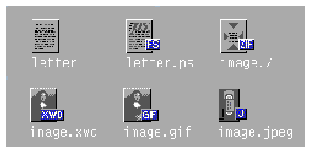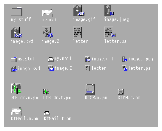 File Manager is the tool that provides for the presentation and organization of the user's file structure. The basic types of iconic objects displayed in File Manager are files, directories (folders), executables, and actions. These objects are referred to as documents, folders, and applications. File Manager displays the icons in two sizes, called Icon and Small Icon views in the Set View Properties dialog box. Icon is 32x32 pixels and Small Icon is 16x16 pixels. Figure 13-1 shows both icon sizes.