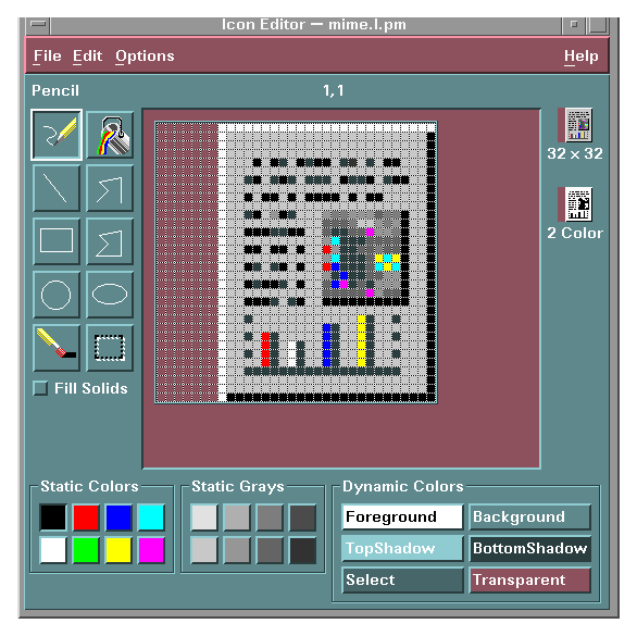 CDE runs in both color and monochrome modes, so you must create your icons in two formats: XBM (X bitmap) for monochrome and XPM (X pixmap) for color. The Icon Editor saves icon files to both formats.