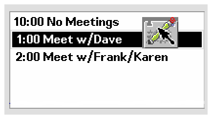 In cases where the user does not select an icon to start a drag, it is still appropriate to show a relevant graphic in the drag icon, especially if that graphic will be used by the destination application upon the drop. For example, in Calendar Appointment Editor, the user can select an appointment from the scrolling list, which does not show icons. An appointment icon is used as part of the drag icon. If the appointment were dropped on File Manager, File Manager would display the appointment, using the same graphic.
