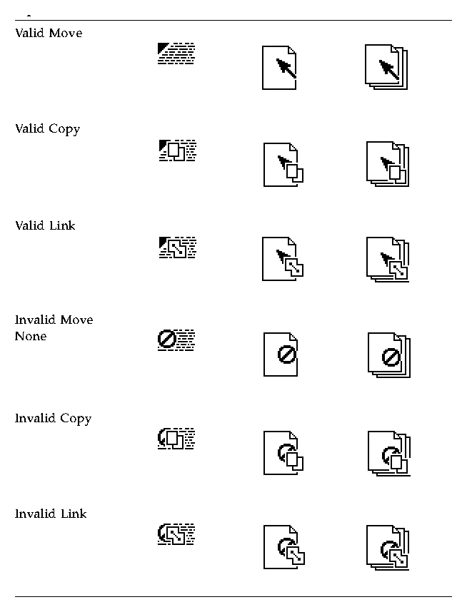 In CDE three operations are associated with the drag icon. These operations are explained in “Parts of a Drag Icon”. The drag icon has alternate graphics that indicate to the user when the operation is a copy or link. The default operation, move, requires no alternate icon graphics.