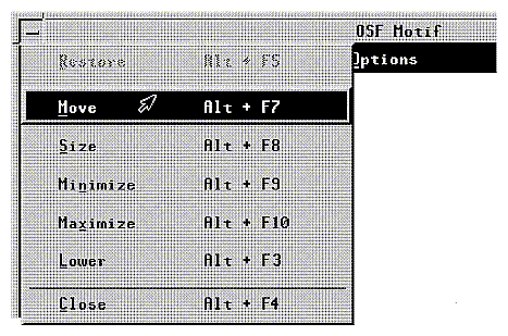 You can also move a window from the keyboard. First, select Move from the Window Menu or press the accelerator Alt F7. The arrow keys move the window in the direction of the arrow. Holding down Ctrl as you press the arrow keys moves the window in larger increments (see Table 2-4). You can also move the window by moving the mouse after the move operation has been initiated from the keyboard. Press Return to complete the move operation.