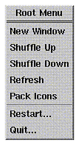 The root menu provides access to mwm functionality that relates to the screen as a whole. For example, the root menu may contain selections to create a new window or restart mwm. You can specify items for the root menu in the mwm configuration file (see Chapter 6).