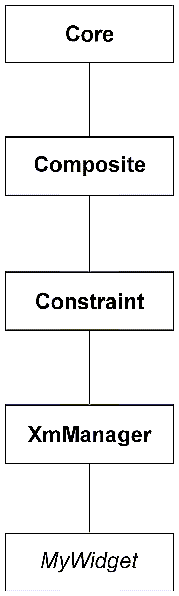 This chapter explains how to write a class record for subclasses of the XmManager widget. As shown in Figure 4-1, the manager widgets you write will descend from the Core, Composite, Constraint, and XmManager widgets.