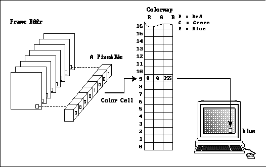 A color display uses multiple bits per pixel (also referred to as multiple planes or the depth of the display) to select colors. Programs that draw in color use the value of these bits as a pointer to a lookup table called a colormap, in which each entry (or colorcell) contains the RGB values for a particular color.[106] As shown in Figure B-1, any given pixel value is used as an index into this table--for example, a pixel value of 16 will select the sixteenth colorcell.