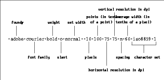 This appendix describes the possible values for color, font, and geometry specifications. For fonts, it first describes basic font naming, and then the font service and scalable font capabilities added in Release 5.
