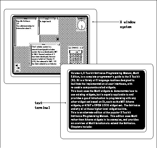 X controls a “bit-mapped” display in which each pixel on the screen is individually controllable. This allows applications to draw pictures as well as text. Until recently, individual control of screen pixels was widely available only on personal computers (PCs) and high-priced technical workstations. Most general-purpose machines were limited to output on text-only terminals. X brings a consistent world of graphic output to both PCs and more powerful machines. Figure 1-1 compares an X application to an application running on a traditional text terminal.