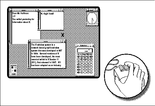 X takes user input from a pointer. The pointer is usually a mouse but could just as well be a track-ball or a tablet. The pointer allows the user to control a program without using the keyboard, by pointing at objects drawn on the screen such as menus and command buttons. This method of using programs is often easier to learn than traditional keyboard control because it is more intuitive. Figure 1-2 shows an application with a typical three-button pointer being used to select a menu item.