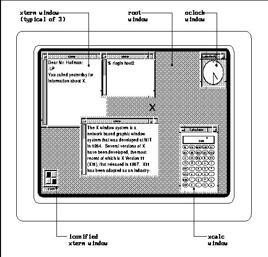 Like other windowing systems, X divides the screen into multiple input and output areas called windows. Using a terminal emulator, windows can act as “virtual terminals,” running ordinary text-based applications. However, as shown in Figure 1-1, windows can also run applications designed to take advantage of the graphic power of the bitmapped display.