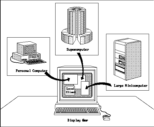 It is common for a user to have programs running on several different hosts in the network, all invoked from and displaying their windows on a single screen (see Figure 1-4). Clients running remotely can be started from the remote machine or from the local machine using the network utilities rlogin or rsh.