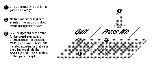 In the version of xbox we just looked at, keyboard events propagate through the Command widgets to the Box widget, because they are not selected by the Command widgets. When they reach the Box widget, they match the events specified in the accelerator table and invoke actions from the quit widget.